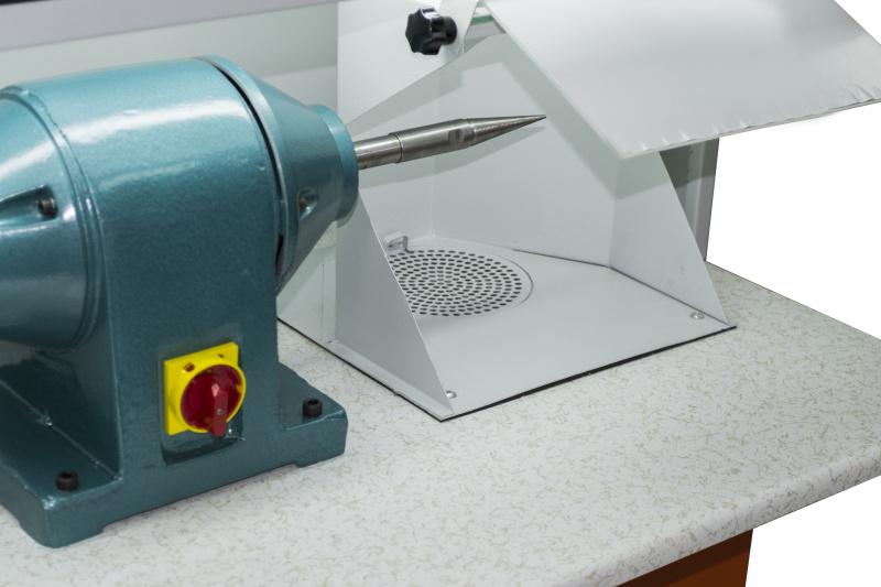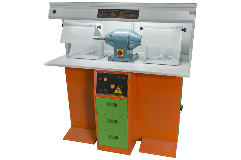 Полірувальний верстат призначений для шліфувально-полірувальних робіт як на великих, так і на невеликих ювелірних виробництвах. Має посадочні місця для роботи двох операторів. Верстат складається з робочого столу на два місця, на якому розміщені двигун з двома шпинделями, освітлювальна люмінесцентна лампа, два захисних скла і панель управління та витяжна шафа. За допомогою цього обладнання можна з легкістю обробити металеву поверхню будь-якої складності - починаючи від площин і зовнішніх циліндричних поверхонь, закінчуючи складними вигнутими деталями. Для полірування виробів застосовується полірувально-шліфувальний інструмент різного виду, із застосуванням будь-яких полірувальних паст. Верстат оснащений двошпиндельним полірувальним мотором. Верстат обладнаний системою освітлення і системою витяжки з фільтром для очищення повітря. Також він має знижений рівень шуму. Відмінною особливістю цього верстата є те, що збір полірувальних відходів збирається у 2 фільтри, окремо для кожного з операторів.