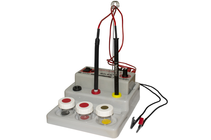 Апарат для локального декоративного гальванічного покриття за допомогою олівця. Підходить для чистого, жовтого і червоного золота, глянцевого білого і чорного родію, паладію, срібла, міді, нікелю і т.д. За допомогою спеціального фіброелектрода можливе нанесення тонких контурів. Комплектація: гальванокарандаш: 2 шт; прищіпка "крокодил": 2 шт .; ємність для розчину: 3 шт.