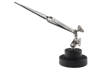 Зручне фіксуючий пристрій з круглим підставою має важку нековзну підставку, забезпечену кульовим шарнірних з`єднань & shy; му, що дозволяє зафіксувати оброблюваний виріб в будь-якому необхідному положенні. На дана підстава можуть встановлюватися різні типи пінцетів і затискачів. Пристрій незамінне для склеювання або пайки деталей, тому що дозволяє працювати обома руками. Пінцет зворотної дії довжиною & nbsp; 165 мм встановлюється на круглу підставу підставки.