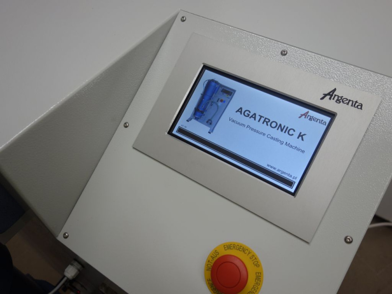 Машина вакуумного лиття під тиском Agatronic К являє собою комбінований пристрій з вбудованою низькочастотною індукційною піччю для лиття ювелірних виробів методом лиття за моделями, що виплавляються. За ходом процесу стежить спеціальний мікропроцесорний контролер, побудований з урахуванням нових рішень у галузі промислової автоматизації. Контролер взаємодіє із оператором через 7-дюймовий сенсорний TFT-дисплей. У цій повністю автоматичній машині процес лиття заготовки здійснюється відповідно до запрограмованого алгоритму, а операційна діяльність обмежується тільки наповненням тигля сплавом, завантаженням опоки в камеру і натисканням кнопки START. Приблизно за 3-4 хвилини пристрій відкриває камеру для лиття і повідомляє про це звуковим сигналом. Крім того, за 15 хвилин після завершення циклу лиття, машина нагадає про необхідність розмити опоку. Також оператор може використовувати функцію вібрації. При заповненні опоки рідким металом камера для лиття вібрує з постійною частотою, що прискорює процес заповнення опоки рідким металом і підвищує гомогенізацію сплаву.