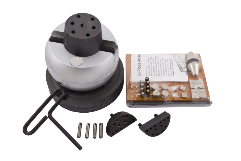 Універсальні лещата для кріплення ювелірних виробів і заготовок при гравірування. Лещата поміщені на спеціальну підставку з каучукової прокладкою, що дозволяє їх легко повертати під необхідним кутом. У комплект входять затискні вставки і штифти (35 штук), за допомогою яких можна фіксувати вироби самих різних форм і розмірів. Кут повороту щодо опори: 0-360 градусів. Діаметр лещат: 127 мм. Висота: 137 мм. Хід губок: 0-80 мм. Ширина губок: 60 мм.
